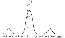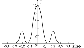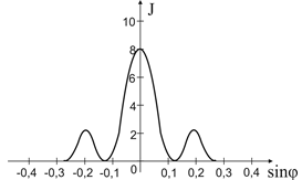 1.40. Имеются 4 дифракционные решетки с различными постоянными d, освещаемые одним и тем же монохроматическим излучением различной интенсивности. Какой рисунок иллюстрирует положение главных максимумов, создаваемых дифракционной решеткой с наибольшей постоянной решетки? (J – интенсивность света, φ – угол дифракции).- 1)