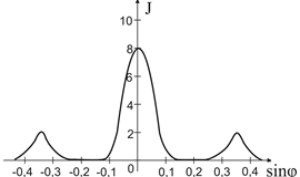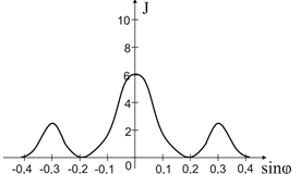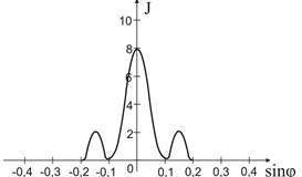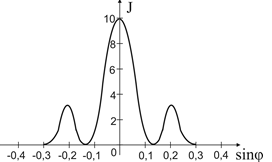 1.41. Имеются 4 дифракционные решетки с различными постоянными d, освещаемые одним и тем же монохроматическим излучением различной интенсивности. Какой рисунок иллюстрирует положение главных максимумов, создаваемых дифракционной решеткой с наименьшей постоянной решетки? (J – интенсивность света, – φ угол дифракции).- 1)