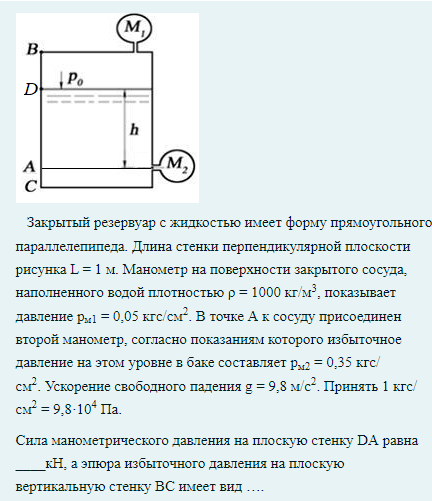 Закрытый резервуар с жидкостью имеет форму прямоугольного параллелепипеда. Длина стенки перпендикулярной плоскости рисунка L = 1 м. Манометр на поверхности закрытого сосуда, наполненного водой плотностью ρ = 1000 кг/м3, показывает давление рм1 = 0,05 кгс/см2. В точке А к сосуду присоединен второй манометр, согласно показаниям которого избыточное давление на этом уровне в баке составляет рм2 = 0,35 кгс/см2. Ускорение свободного падения g = 9,8 м/с2. Принять 1 кгс/см2 = 9,8·104 Па.Сила манометрического давления на плоскую стенку DА равна _кН, а эпюра избыточного давления на плоскую вертикальную стенку ВС имеет вид
