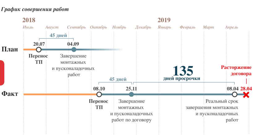 Для выполнения работ по монтажу оборудования, выполнения пуско-наладочных и прочих работ был заключен договор подряда. Договор был расторгнут на основании нарушения сроков выполнения 1-го этапа работ.На рисунке ниже показан график совершения работ по договору подряда, выполненный в системе Legal Design.