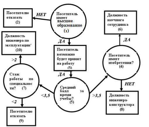 В HR-отделе предприятия «Наука» используют экспертную систему по подбору кадров. На рисунке ниже показано дерево решений этой экспертной системы. Документы подал специалист, имеющий изобретения, со стажем 8 лет и со средним баллом в дипломе, равным 3.