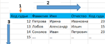 Установите соответствие между элементами структуры таблицы реляционной базы данных, которые обозначены цифрами (см. таблицу ниже), и их названиями: