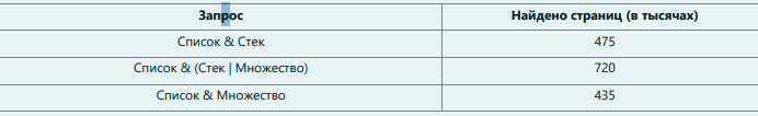 Какое количество страниц (в тысячах) будет найдено по запросу Список & Стек & Множество? Считается, что все запросы выполнялись практически одновременно, так что набор страниц, содержащих все искомые слова, не изменялся за время выполнения запровОтвет