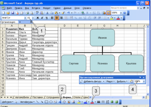 С помощью каких элементов в данной ситуации можно изменить размер шрифта элементов организационной диаграммы?