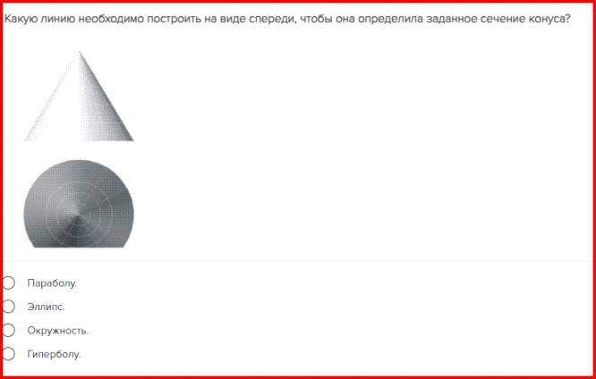 Ответ на вопрос по инженерной графике №33647: Какую линию необходимо построить на виде спереди, чтобы она определила заданное сечение конуса? Параболу. Эллипс. Окружность. Гиперболу. Какую линию необходимо построить на виде - Ответ на вопрос по инженерной графике №33647Какую линию необходимо построить на виде - Ответ на вопрос по инженерной графике №33647