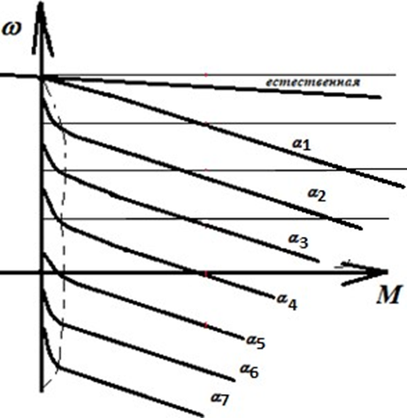 При работе от управляемого тиристорного преобразователя (ТП) механические характеристики электродвигателя постоянного тока независимого возбуждения имеют указанный на рисунке вид. Выберите характеристики, соответствующие углу открытия тиристоров больше девяноста градусов (a > 90°).