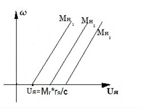 На рисунке представлено семейство статических характеристик двигателя постоянного тока с независимым возбуждением, полученные при разных значениях момента нагрузки на валу двигателя (Мн). Какой из трех моментов нагрузки имеет наибольшее значение?
