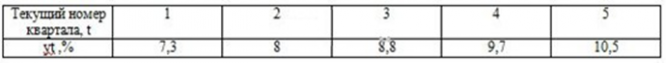 Ответ на вопрос №660371: Если ежеквартальная динамика процентной ставки банка представлена в таблице ниже, то процентная ставка банка в 6 квартале, рассчитанная с помощью среднего абсолютного прироста с точностью до десятых, составит … 11,3 % 11,6 %. 11,1 % 10,9 % Если ежеквартальная динамика процентной ставки банка представлена в - Ответ на вопрос №660371Если ежеквартальная динамика процентной ставки банка представлена в - Ответ на вопрос №660371