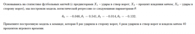 Основываясь на статистике футбольных матчей (с предикторами X, - удары в створ ворот; X2 - процент владения мячом; Хз - удары в сторону ворот), мы построили модель логистической регрессии со следующими параметрамиПримените построенную модель к команде, которая 8 раз ударила в сторону ворот, 4 раза ударила в створ ворот и владела мячом 40 процентов игрового времени.