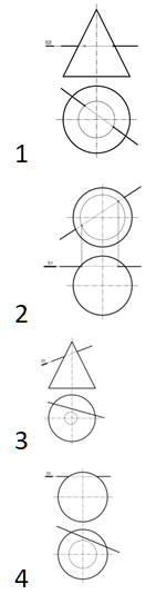 Проставьте последовательно определения в следующем порядке: прямая пересекает конус, прямая пересекает шар, прямая не пересекает конус, прямая не пересекает шар: