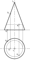 Расставьте точки на поверхности конуса в следующем порядке: точка лежит на основании конуса, точка лежит на вершине конуса, точка принадлежит очерковой конуса, точка лежит на поверхности конуса (см. рисунок ниже):
