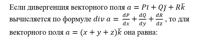 Если дивергенция векторного поля а= Pj + Qj+ Rkвычисляется по формуле div a = dP/dx + dQ/dy+ dR/dz, то для векторного поля а= (х+y+z)K она равна: