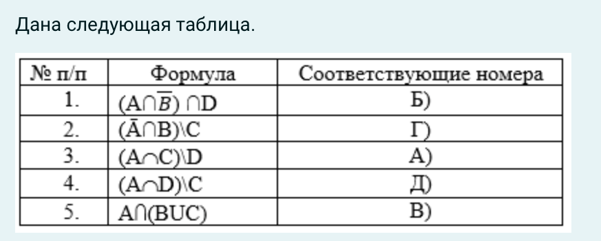 Ответ на вопрос №934712: Дана следующая таблица. I={ученики начальной школы}— универсальное множество A={мальчики} B={изучают английский} C={изучают немецкий} D={изучают испанский} Изучите таблицу. Расшифруйте формулы. Выберите из выпадающего списка только один правильный ответ. А) Мальчики, которые не изучают английский, но изучают испанский Б) Девочки, изучающие английский, но не изучающие немецкий В) Мальчики, изучающиеДана следующая таблица. I={ученики начальной школы}— универсальное - Ответ на вопрос №934712Дана следующая таблица. I={ученики начальной школы}— универсальное - Ответ на вопрос №934712