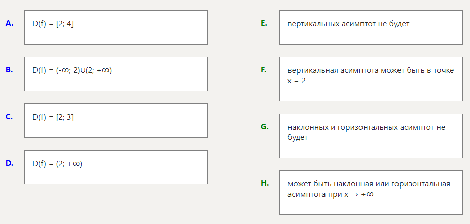 Ответ на вопрос по математике №1064170: Установите соответствие областей определения функции (D(f)) и соответствующих асимптот: Тип ответа: Сопоставление• A. D(f) = [2; 4] B. D(f) = (-∞; 2)∪(2; +∞) C. D(f) = [2; 3] D. D(f) = (2; +∞) E. - вертикальных асимптот не будет F. - вертикальная асимптота может быть в точке х = 2 G. - наклонных и горизонтальных асимптот не будет H. - может быть наклонная или горизонтальная асимптота при х → +∞ Установите соответствие областей определения функции - Ответ на вопрос по математике №1064170Установите соответствие областей определения функции - Ответ на вопрос по математике №1064170