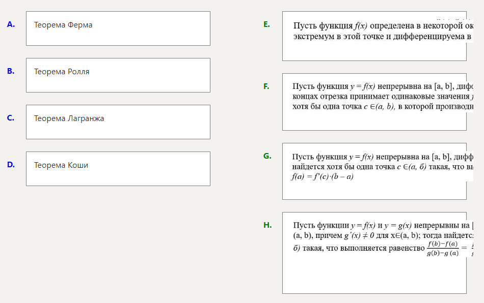 Ответ на вопрос по математике №1064234: Установите соответствие теоремы и ее формулировки: Тип ответа: Сопоставление• A. Теорема Ферма B. Теорема Ролля C. Теорема Лагранжа D. Теорема Коши E. - Пусть функция f(x) определена в некоторой ок экстремум в этой точке и дифференцируема в F. - Пусть функция у = f(x) непрерывна на [a, b], дифс концах отрезка принимает одинаковые значения хотя бы одна точка с E(a, b), в которой производн G. - ПустьУстановите соответствие теоремы и ее формулировки: - Ответ на вопрос по математике №1064234Установите соответствие теоремы и ее формулировки: - Ответ на вопрос по математике №1064234