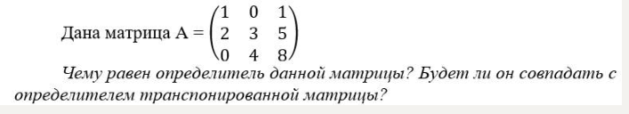 Дана матрица A = ((1, 0, 1), (2, 3, 5), (0, 4, 8)) Чему равен определитель данной матрицы? Будет ли он совпадать с определителем транспонированной матрицы?