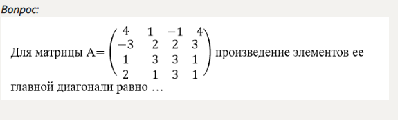 Ответ на вопрос по математике №1076828: Для матрицы A = ((4, 1, –1, 4), (–3, 2, 2, 3), (1, 3, –3, 1), (2, 1, 3, 1)) произведение элементов ее главной диагонали равно … Тип ответа: Одиночный выбор• 24 36 48 16 Для матрицы A = ((4, 1, –1, 4), (–3, 2, 2, 3), (1, 3, - Ответ на вопрос по математике №1076828Для матрицы A = ((4, 1, –1, 4), (–3, 2, 2, 3), (1, 3, - Ответ на вопрос по математике №1076828