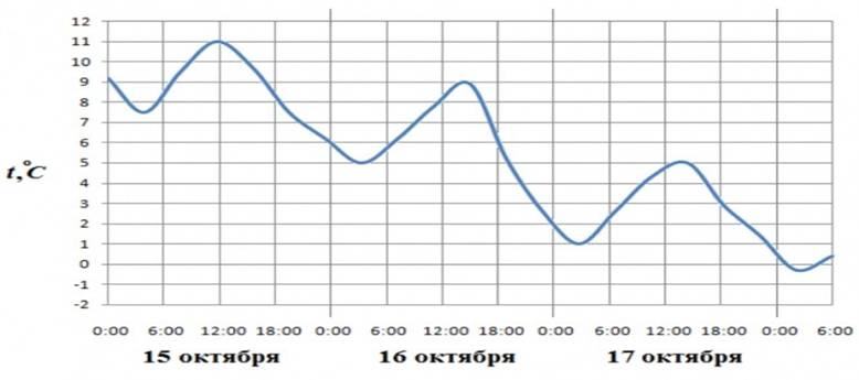 На рисунке показано изменение температуры воздуха на протяжении трех суток. По горизонтали указывается дата и время суток, по вертикали — значение температуры в градусах Цельсия. Определите по рисунку наибольшую температуру воздуха 15 октября. Ответ дайте в градусах Цельсия.- 5