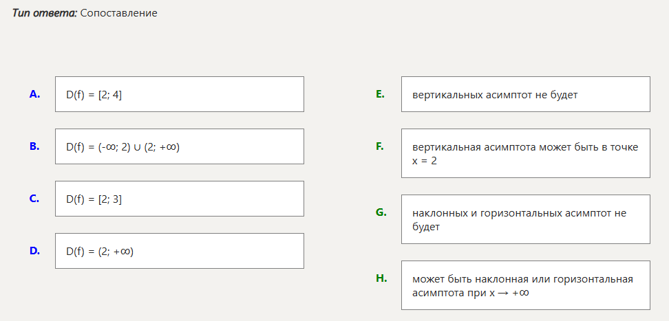 Установите соответствие области определения функции D(f) и наличия соответствующих асимптот: