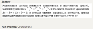 Расположите условия взаимного расположения в пространстве прямой, заданной уравнением и плоскости, заданной уравнением х-хо 1 У-у-2-20 m 71 Ах + Ву + С2 + 0 = 0, в порядке «прямая параллельна плоскости, прямая перпендикулярна плоскости, прямая образует с плоскостью угол »Тип ответа: Сортировка