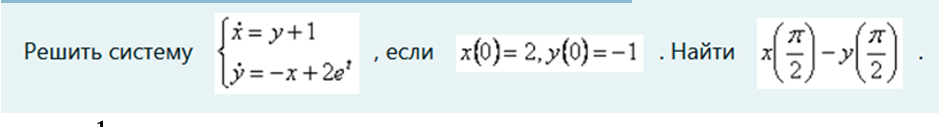 Ответ на вопрос по математике №960465: Решить систему x` = y + 1, y` = – x + 2e ͭ, если x(0) = 2, y(0) = – 1. Найти x(π/2) – y(π/2). Решить систему x` = y + 1, y` = – x + 2e ͭ, - Ответ на вопрос по математике №960465Решить систему x` = y + 1, y` = – x + 2e ͭ, - Ответ на вопрос по математике №960465