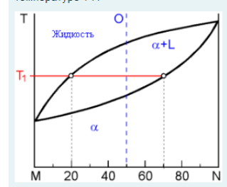 Сплав О состоит на 50% из компонента М и 50% компонента. Какова массовая доля жидкой фазы сплава при температуре Т1?