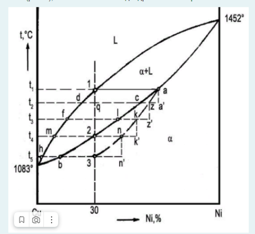 Каким компонентом будут обогащены центральные части зерен твердого раствора и каким периферия в сплаве Си-30% Ni (рис. 1), если в нем имеется дендритная ликвация?
