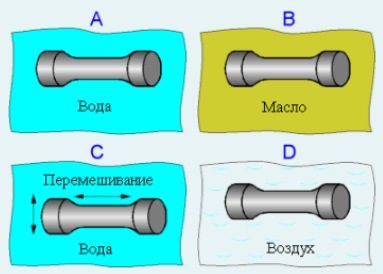 Рассмотрим закалку стального образца с охлаждением в различных средах.В каком случае твердость максимальная?