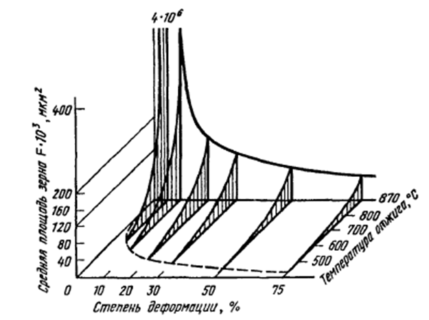 Наглядное представление о влиянии температуры и степени деформации на размер зерна дают диаграммы рекристаллизации. Данные диаграммы строятся в координатах Средняя площадь зерна – степень деформации – температура отжига. Пример диаграммы рекристаллизации приведен на рисунке 5.