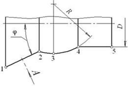 На рисунке показан профиль, для обработки которого используется неортогональный фасонный резец с направлением врезания A, перпендикулярным образующей 1–2. В этом случае базовая линия профиля проходит через точку (точки)
