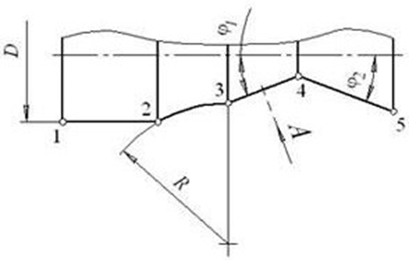 На рисунке показан профиль, для обработки которого используется неортогональный фасонный резец с направлением врезания A, перпендикулярным образующей 3–4. В этом случае базовая линия профиля проходит через точку (точки)