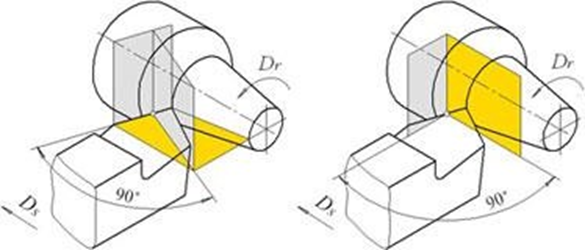 На рисунках показаны плоскости единой геометрии, проведенные через некоторую точку главной режущей кромки токарного резца. Желтым цветом выделены