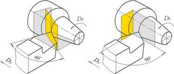 На рисунках показаны плоскости единой геометрии, проведенные через некоторую точку главной режущей кромки токарного резца. Желтым цветом выделены