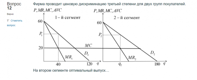 Фирма проводит ценовую дискриминацию третьей степени для двух групп покупателей.На втором сегменте оптимальный выпуск…