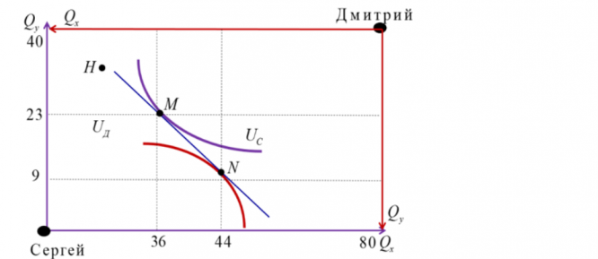 - выполняется условие равновесия, присущее сделке между двумя субъектами в обмене MRSДмитрийху=MRSСергейху=PхPу���хуДмитрий=���хуСергей=�х�у.