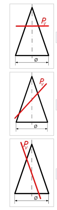 Установите правильное соответствие между секущими плоскостями Р и кривыми, которые получаются в сечении