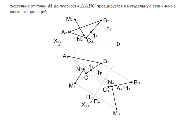 Расстояние от точки M до плоскости ABC проецируется в натуральную величину на плоскость проекций