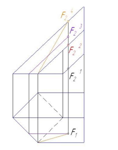 Проекции точки F(F1 ), принадлежащей поверхности наклонной призмы, на П2 соответствует точка