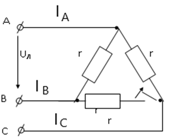 Определить линейные токи в цепи при замкнутом и разомкнутом ключе, если UЛ =380 В; r = 190 Ом