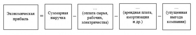 Расположите элементы формулы вычисления экономической прибыли путем последовательного вычитания издержек из выручки (см. схему ниже) в порядке слева направо: