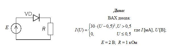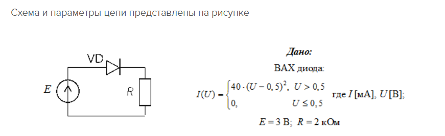 - Определите постоянную составляющую тока в цепи, если напряжение на диоде uд(t) = 0,55 + 0,1∙cos(103t) В; ответ приведите в [мкА].
