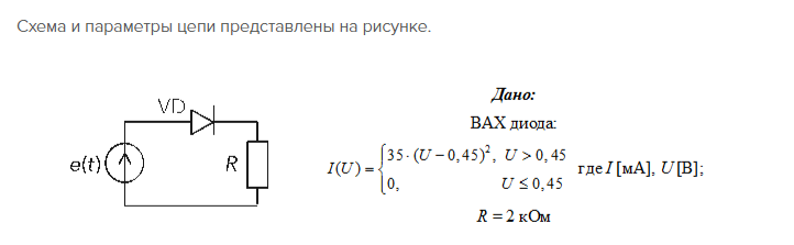 - Определите число гармонических составляющих тока в цепи (постоянную составляющую учитывать не нужно), если напряжение на диоде uд(t) = 0,8 + 0,1∙cos(103t) + 0,2∙cos(1,8∙103t) В.