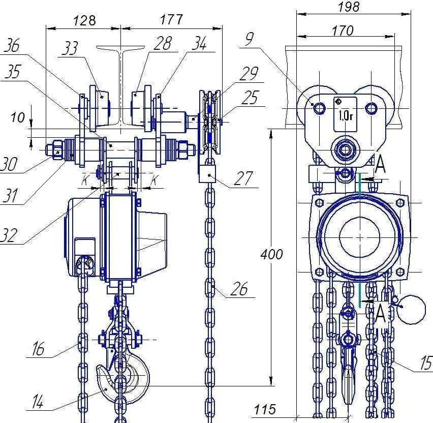 Пример тали с ручным приводом. В талях с ручным приводом передвижение тали осуществляется с помощью тяговых звездочек, приводимых в движение с помощью цепей, которые тянутся силой рабочего, при этом диаметр звездочки подбирают таким образом, чтобы прикладываемая рабочим сила и скорость движения руки (создающие крутящий момент на ведущем ролике ручной тали) не превышали (при непрерывной работе в течение 6-8 часов): 80...100 Ни 0,9...1,2 м/с при использовании рукоятки;