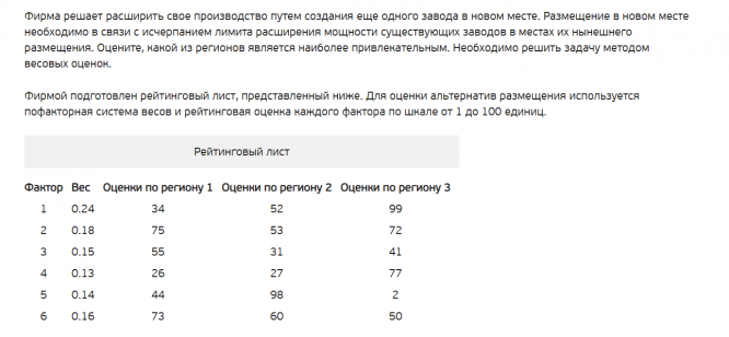 Фирма решает расширить свое производство путем создания еще одного завода в новом месте. Размещение в новом месте необходимо в связи с исчерпанием лимита расширения мощности существующих заводов в местах их нынешнего размещения. Оцените, какой из регионов является наиболее привлекательным. Необходимо решить задачу методом весовых оценок.Фирмой подготовлен рейтинговый лист, представленный ниже. Для оценки альтернатив размещения используется пофакторная система весов и рейтинговая оценка каждого фактора по шкале от 1 до 100 единиц.