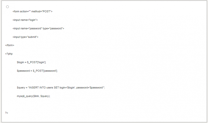 - 1️⃣ ˂form action="" method="POST"˃ ˂input name="login"˃ ˂input name="password" type="password"˃ ˂input type="submit"˃ ˂/form˃ ˂?php if (!empty($_POST['login']) and !empty($_POST['password'])) { $login = $_POST['login']; $password = $_POST['password']; $query = "INSERT INTO users SET login='$login', password='$password'"; mysqli_query($link, $query); } ?˃