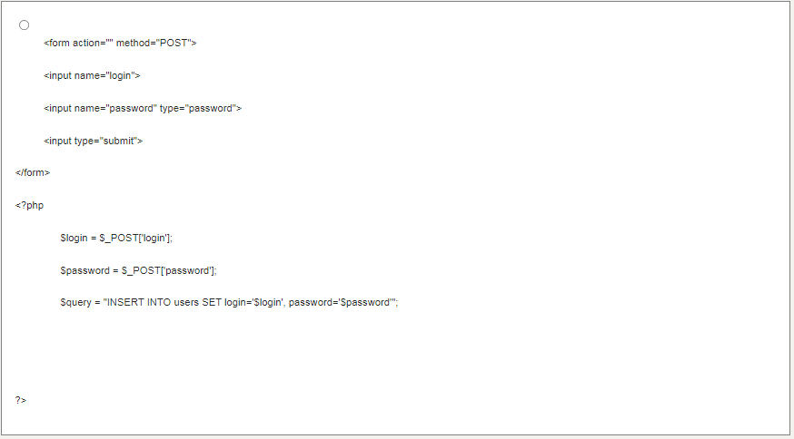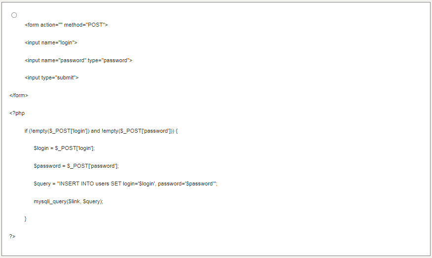 Требуется реализовать регистрацию пользователя на сайте. Для этого нужно создать форму, которая состоит из полей для ввода логина и пароля, а также кнопки. После ввода данных в поля и при нажатии на кнопку данные с формы должны записываться в базу данных в соответствующие поля. Разработайте программу по заданным условиям.- 1️⃣ ˂form action="" method="POST"˃ ˂input name="login"˃ ˂input name="password" type="password"˃ ˂input type="submit"˃ ˂/form˃ ˂?php if (!empty($_POST['login']) and !empty($_POST['password'])) { $login = $_POST['login']; $password = $_POST['password']; $query = "INSERT INTO users SET login='$login', password='$password'"; mysqli_query($link, $query); } ?˃