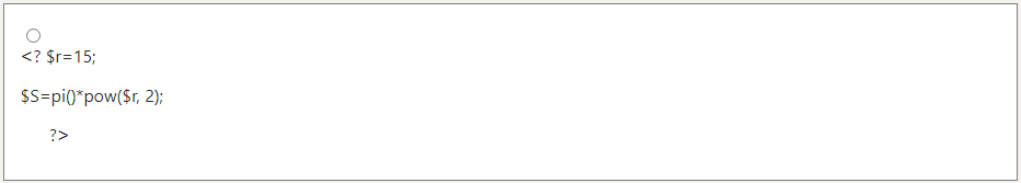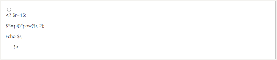 Ответ на вопрос №355247: Вывод данных в браузер осуществляется с помощью функции echo. Функция позволяет выводить данные различных типов. Для возведения в степень используется функция pow(), также в языке PHP для числа Пи зарезервирована функция pi(). Дана переменная r – радиус круга. Необходимо вычислить площадь круга. По соответствующей формуле найдите площадь круга и запишите значение переменной s. Выведите значениеВывод данных в браузер осуществляется с помощью функции echo. - Ответ на вопрос №355247Вывод данных в браузер осуществляется с помощью функции echo. - Ответ на вопрос №355247
