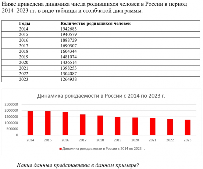 Ниже приведена динамика числа родившихся человек в России в период 201-2023 гг. в виде таблицы и столбчатой диаграммы
