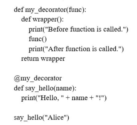 - Создает функцию "my_decorator", которая выводит сообщения до и после вызова функции, а затем применяет ее к функции "say_hello" и вызывает функцию "say_hello"