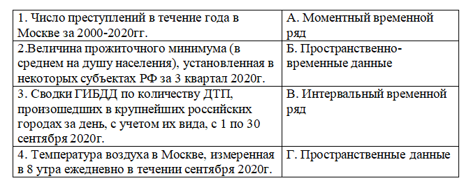 Найдите соответствие между переменной и ее наличию или отсутствию упорядочения во времени- 1-Г, 2-А, 3-Б, 4-В